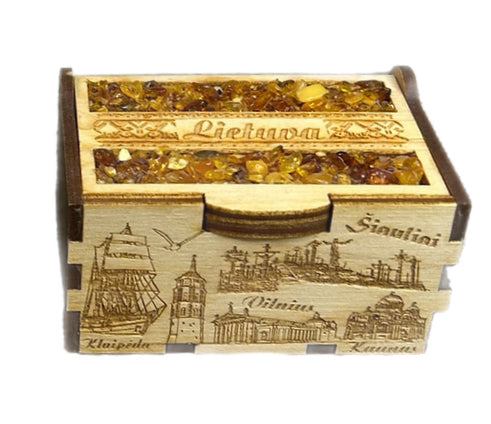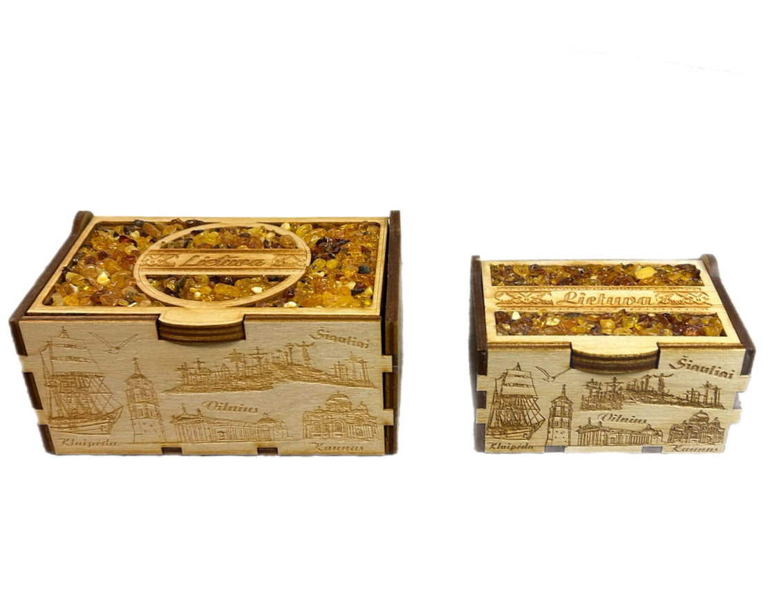 Våra Amber lådor är tillverkade av vackert bärnsten och högkvalitativt trä. Den stora lådan är 7 cm lång och 11 cm bred, medan den lilla lådan är 5 cm lång och 8 cm bred.